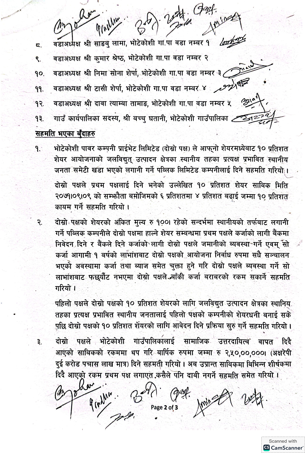 सम्झौता पत्रमा जेनजी पब्लिक इन्भेष्टमेन्ट पब्लिक लिमिटेडका अध्यक्ष फुर्पा शेर्पा र भोटेकोशी कम्पनीका तर्फबाट सचिव विश्वमोहन कर्माचार्य लगायतले हस्ताक्षर गरेका छन् ।