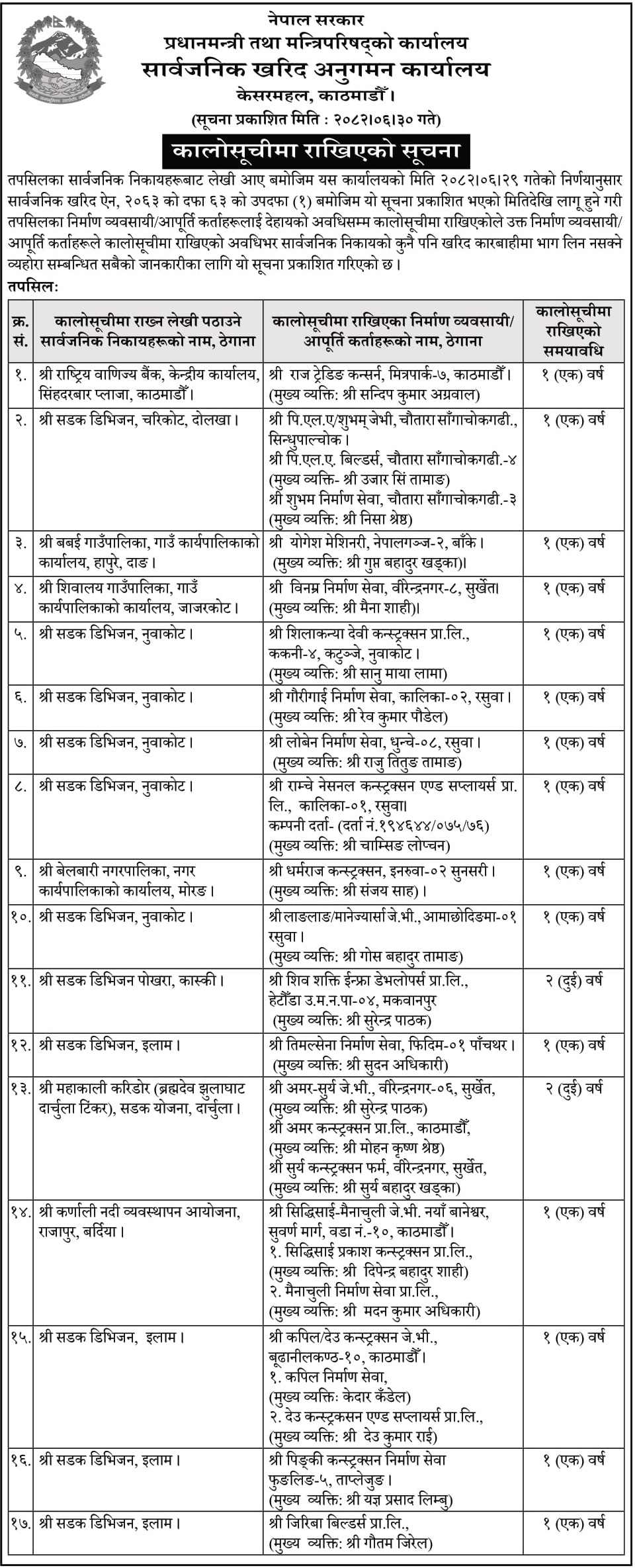 काठमाडौं । सरकारले १७ वटा निर्माण कम्पनीलाई कालोसूचीमा राखेको छ । प्रधानमन्त्री तथा मन्त्रिपरिषद्को कार्यालयअन्तर्गतको सार्वजनिक खरिद अनुगमन कार्यालयले बिहीबार सूचना प्रकाशित गर्दै ती कम्पनीहरूलाई एकदेखि दुई वर्षसम्मका लागि कालोसूचीमा राखिएको हो ।
