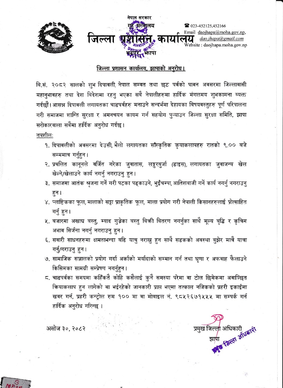 जिल्लाका प्रमुख जिल्ला अधिकारी गोपालकुमार अधिकारीले दीपावली, नेपाल संवत् र छठ पर्वको अवसरमा शुभकामना दिँदै चाडपर्वहरू शान्तिपूर्ण वातावरणमा मनाउन आग्रह गरेका छन् । उनले चाडपर्व मनाउने क्रममा समाजमा शान्ति, अमनचयन र सद्भाव कायम राख्न सबै पक्षको सहयोग आवश्यक रहेको बताए ।