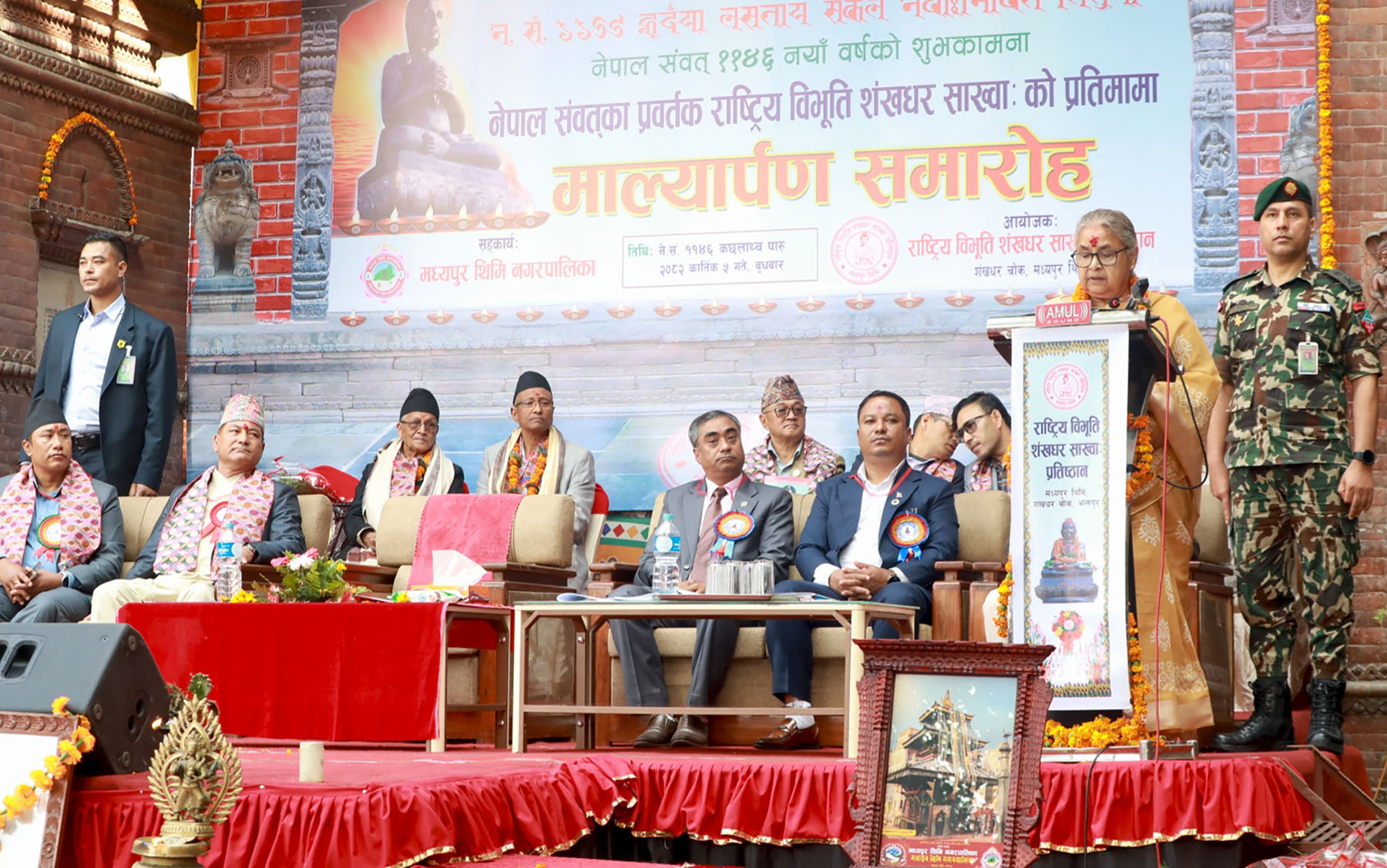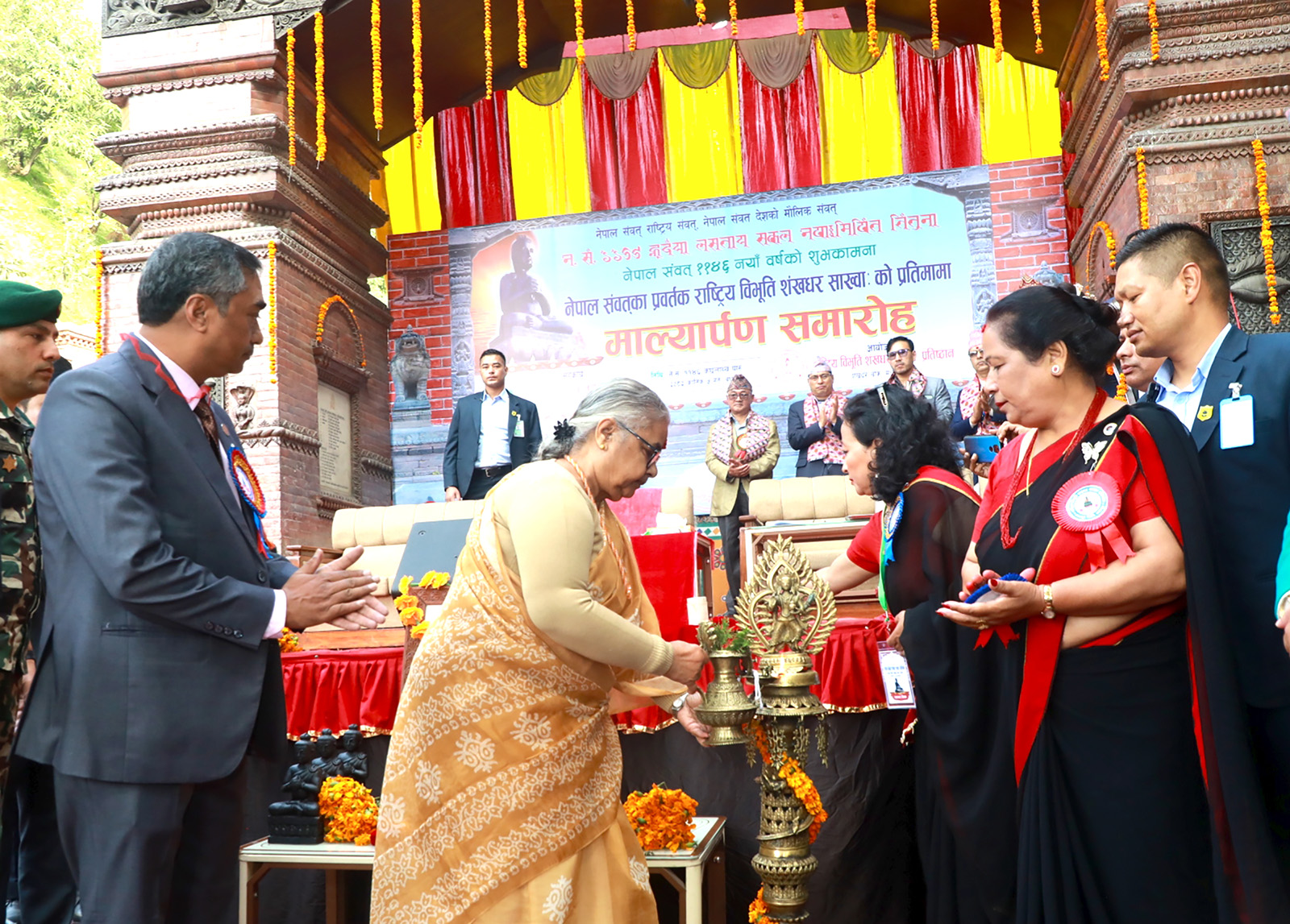 प्रधानमन्त्री सुशिला कार्की राष्ट्रिय विभूति शंखधर साख्वाः प्रतिष्ठानको आयोजनामा नेपाल सम्वत् ११४६ को नयाँ वर्षको दिन बुधबार मध्यपुर थिमि शंखधर चोकस्थित नेपाल सम्वतका प्रवर्तक राष्ट्रिय विभूति शंखधर साख्वाःको प्रतिमामा माल्यार्पण गर्दै ।
