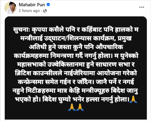 मन्त्री महावीर पुनको आग्रह–शिलान्यास र उद्घाटनलगायतका औपचारिक कार्यक्रममा मलाई नबोलाइदिनु होला