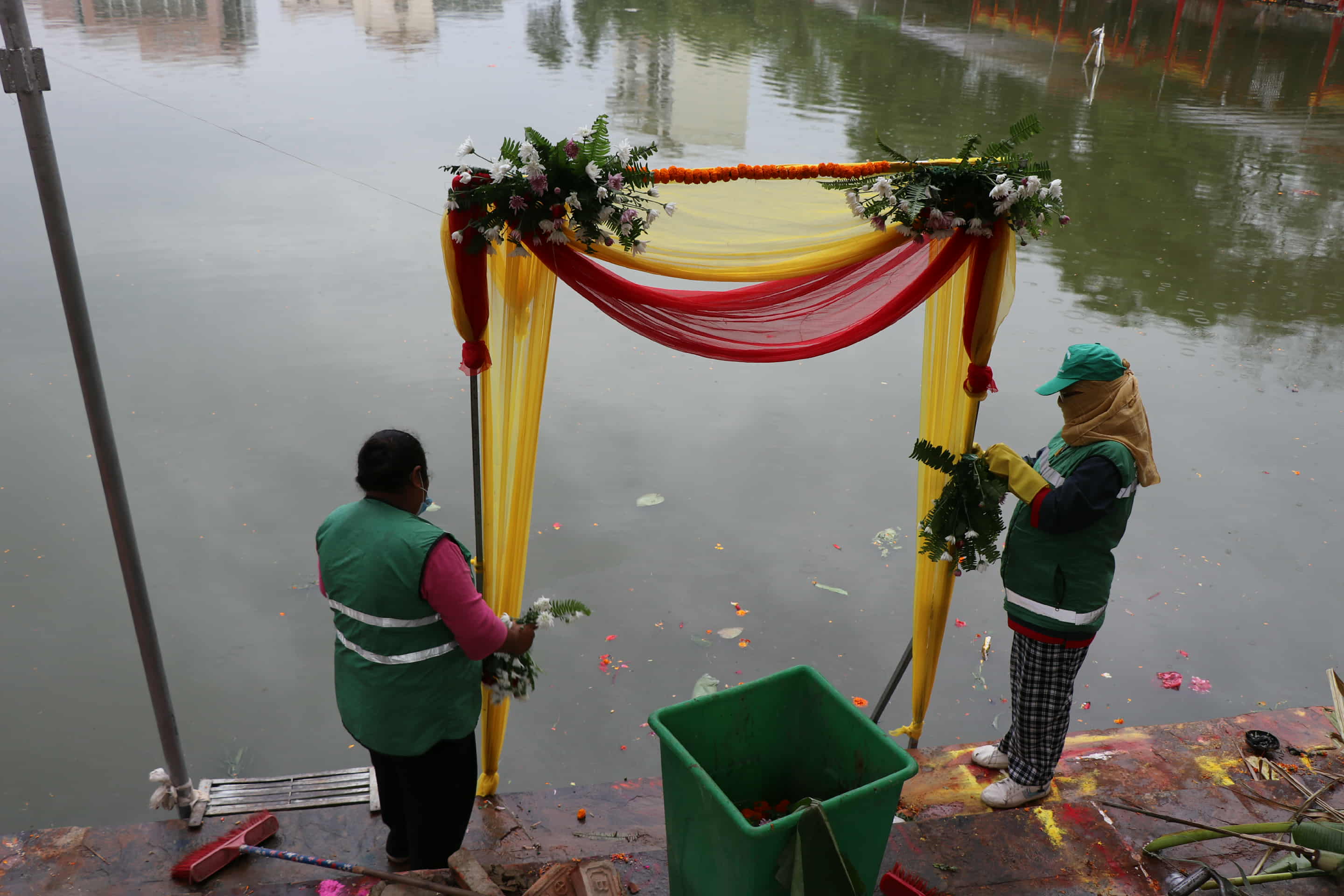 छठ पर्वको अवसरमा व्यवस्था गरिएका मुख्य उपासना स्थलमा काठमाडौँ महानगरले गर्याे सरसफाइ