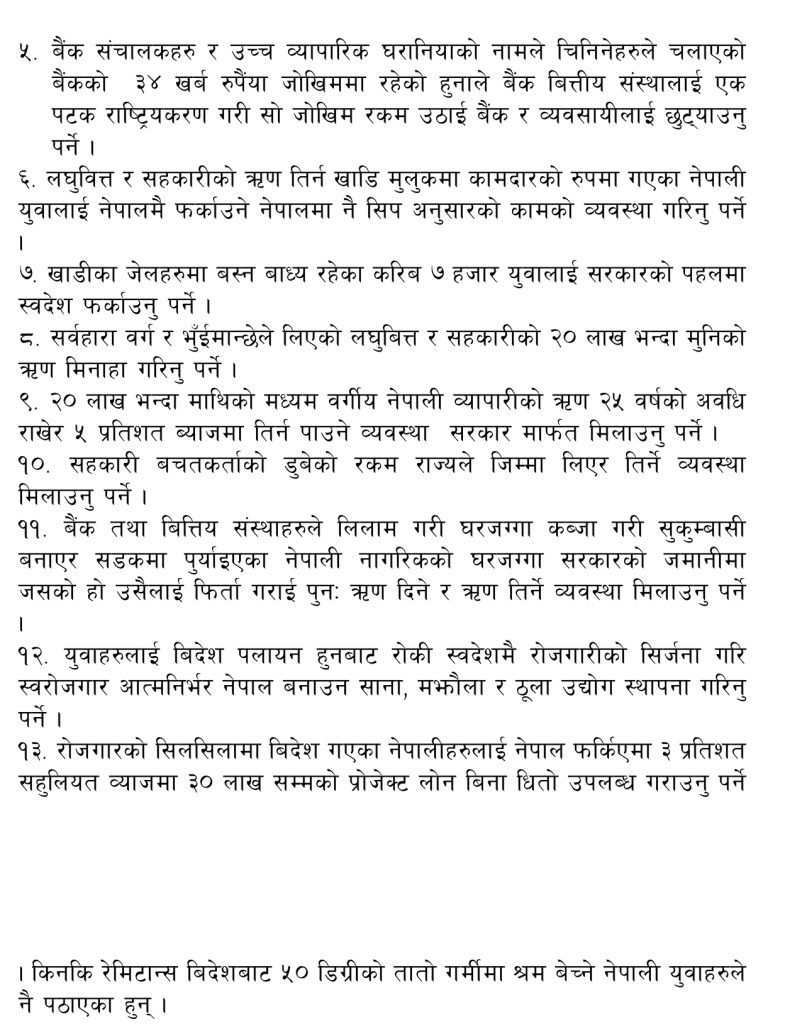 निजामती, प्रहरी र सेनाको न्यूनतम तलब एक लाख हुनुपर्ने बैंक तथा वित्तीय संस्थालाई राष्ट्रियकरण गरी जोखिम न्यूनीकरण गर्नुपर्ने पनि माग राखिएको छ। खाडीमा कामदारका रूपमा गएर जेलमा बस्न बाध्य ७ हजार नेपालीलाई फिर्ता ल्याउनुपर्ने, युवाहरूलाई स्वदेशमा रोजगारीको व्यवस्था गर्नुपर्नेलगायतका माग समेत उल्लेख गरिएको छ ।