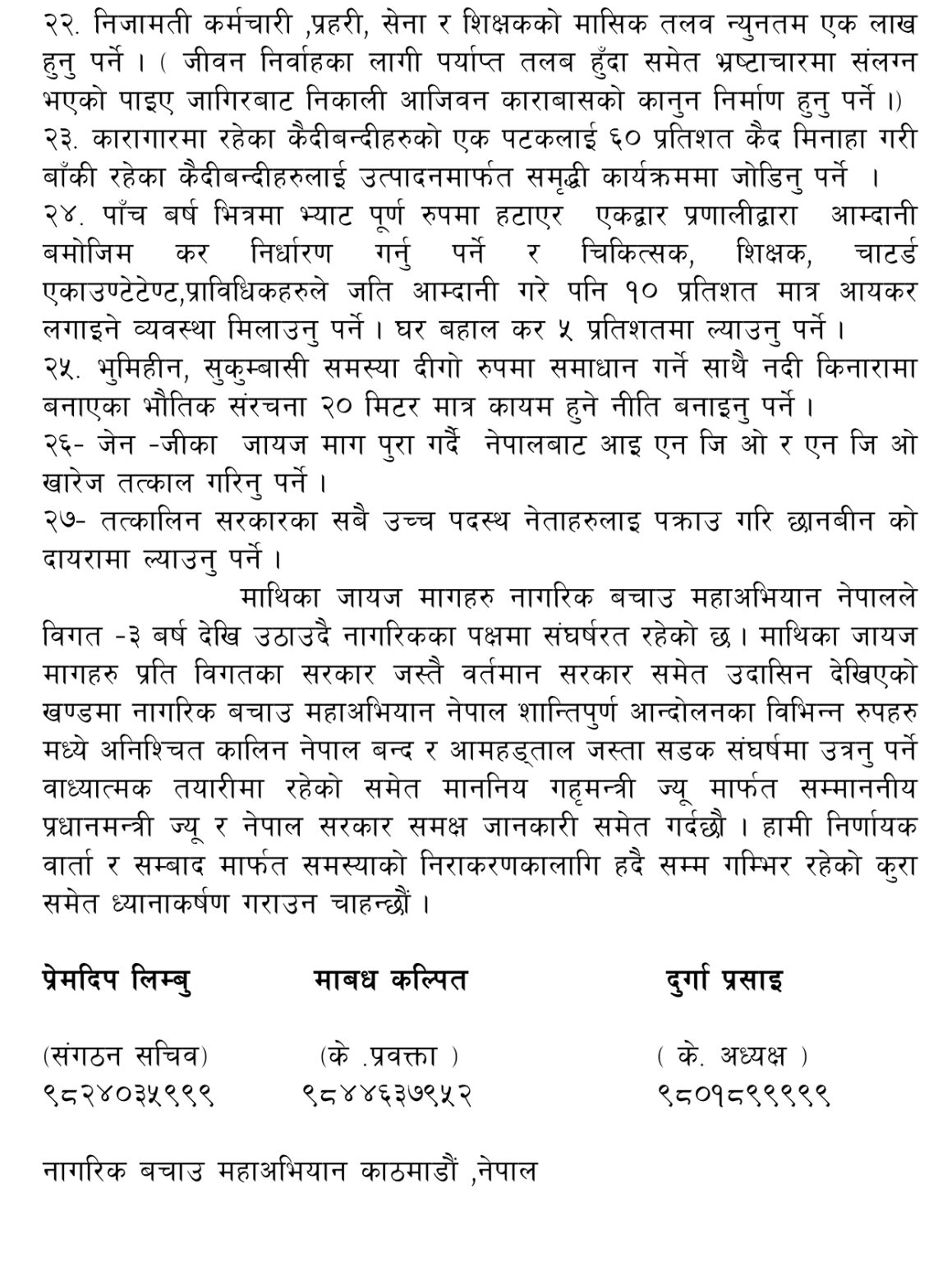 मागपत्रमा संविधान खारेजदेखि, राजसंस्था पुनर्स्थापना र प्रत्यक्ष निर्वाचित कार्यकारी प्रधानमन्त्रीसम्म छन् । साथै बैंक तथा वित्तीय संस्थाबाट लिइएको ऋण मिनाहाका माग पनि समावेश गरिएको छ ।