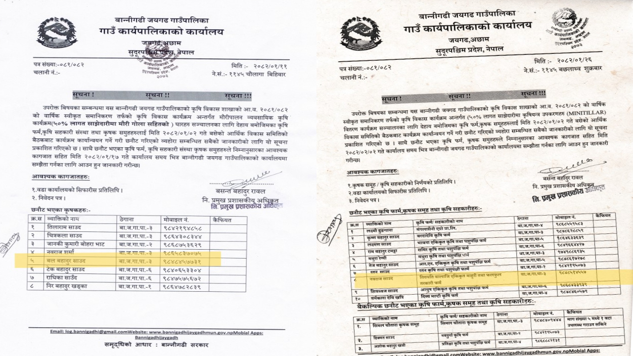 कृषि शाखा प्रमुख गोविन्द सलामी मगरले अनुदान वितरणमा राजनीतिक पहुँच र नातावादको भूमिका नरहेको जिकिर गरे पनि मेयरसाप डटकमले प्राप्त गरेको बान्नीगढी जयगढ गाउँपालिकाको आर्थिक वर्ष २०८१/०८२ को वार्षिक स्वीकृत समानीकरणतर्फको कृषि विकास कार्यक्रमसम्बन्धी कागजात अनुसार, गाउँपालिकाका बहालवाला वडाध्यक्ष नवराज साउँदले नै अनुदान लिएको भेटिएको छ ।