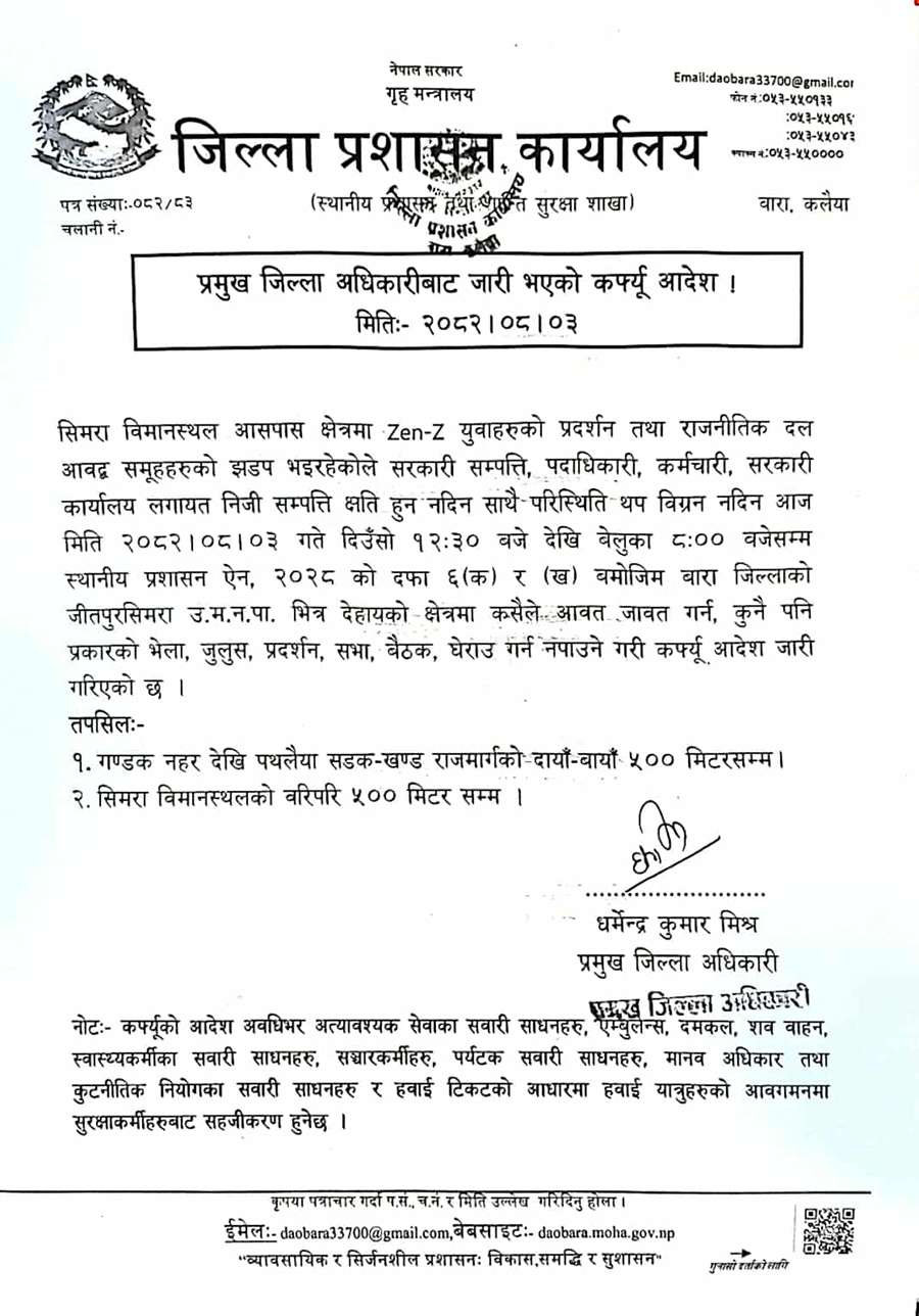 जनकपुरधाम । एमाले नेता महेश बस्नेतको आगमनको विरोधलाई लिएर सिमरा विमानस्थलमा जेन–जी युवा समूह र युवा संघका कार्यकर्ताबीच झडप भएपछि उत्पन्न तनाव नियन्त्रण गर्न जिल्ला प्रशासन कार्यालय बाराले सिमरामा कफ्र्यू आदेश जारी गरेको छ ।