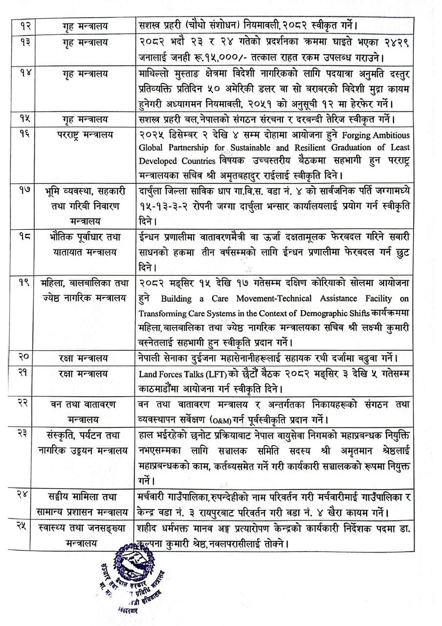 निर्णयअनुसार सहिद धर्मभक्त मानव अङ्ग प्रत्यारोपण केन्द्रको कार्यकारी निर्देशकमा डा. कल्पना कुमारी श्रेष्ठलाई र नेपाल एयरलाइन्सको कार्यकारी सञ्चालकमा नयाँ व्यवस्था नहुँदासम्मका लागि अमृतमान श्रेष्ठलाई नियुक्त गरिएको छ ।