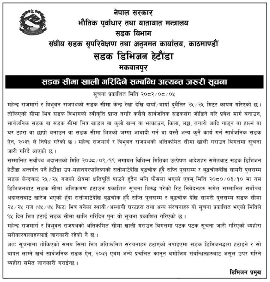मकवानपुर । सरकारले हेटौंडा बजार क्षेत्रको सडक सीमा खाली गराउन १५ दिनको अल्टिमेटमसहित सूचना निकालेको छ । सडक डिभिजन कार्यालय हेटौंडाले आज शुक्रबार सार्वजनिक सूचना जारी गर्दै हेटौंडा उपमहानगरपालिका क्षेत्रभित्र पर्ने महेन्द्र राजमार्ग र त्रिभुवन राजपथ सडकको दायाँबायाँ २५–२५ मिटरमा बनेका स्थायी तथा अस्थायी प्रकृतिका घरटहरा, संरचना हटाउन अल्टिमेटम दिएको हो ।