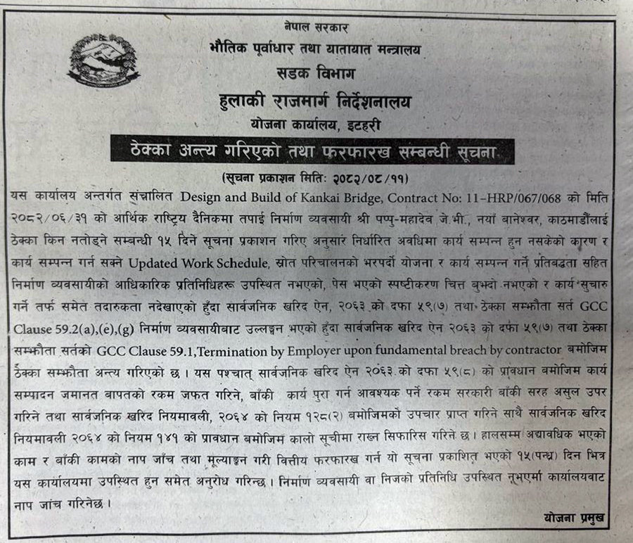 ऐनको प्रावधान बमोजिम कार्य सम्पादन जमानत वापतको रकम जफत गरिने, बाँकी काम पूरा गर्न आवश्यक पर्ने रकम सरकारी बाँकी सरह असुल उपर गरिने र कालोसूचीमा राख्न सिफारिस गरिएको जनाइएको छ । हालसम्मको अद्यावधिक भएको काम र बाँकी कामको नापजाँच मूल्यांकन गरी वित्तीय फरफारख गर्न १५ दिनभित्र कार्यालयमा उपस्थित हुन अनुरोध गरिएको छ । निर्माण व्यवसायी कार्यालयमा उपस्थित नभएमा कार्यालयबाट नापचाँच गरिनेछ ।