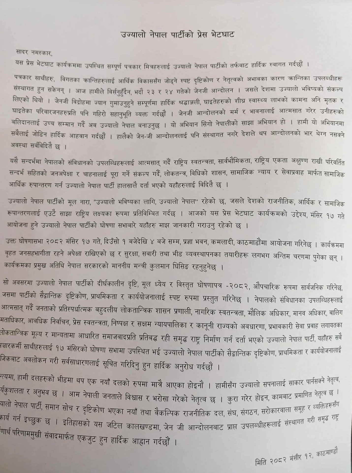 ‘उज्यालो नेपाल पार्टी’ मङ्सिर १७ गते घोषणा हुँदै