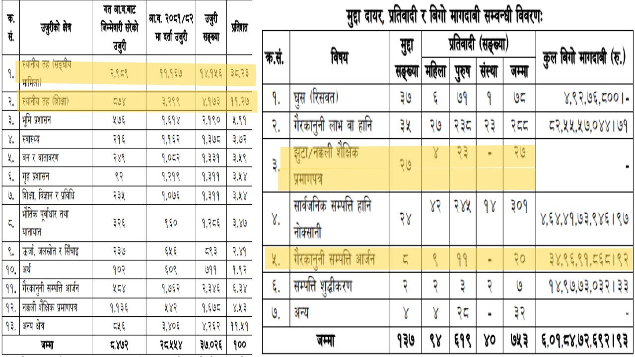 उजुरीको क्षेत्रगत विवरण हेर्दा समग्रमा स्थानीय तह (संघीयमामिला) सँग सम्बन्धित सबैभन्दा धेरै १४ हजार १५६ वटा उजुरी छन्, भने स्थानीय तहको शिक्षा क्षेत्रसँग सम्बन्धित ४ हजार १७३ उजुरी छन् । यस्तै, स्थानीय तहसम्बद्ध गैर–कानुनी सम्पत्ति आर्जन र नक्कली शैक्षिक प्रमाणपत्रसँग सम्बन्धित उजुरीहरूको संख्या पनि उल्लेखनीय छ । अख्तियारले गैर–कानुनी सम्पत्ति आर्जन गर्नेविरुद्ध ३४ करोड ९६ लाख ९१ हजार रुपैयाँ बिगो मागदाबी पनि गरेको छ ।