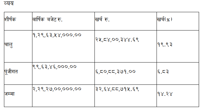 अर्कोतर्फ, प्रशासनिक तथा नियमित कामको लागि विनियोजित चालू बजेटको खर्च भने, तुलनात्मक रूपमा पुँजीगत बजेटको भन्दा बढी छ । वार्षिक १ अर्ब २९ करोड ६६ लाख ५४ हजार चालू बजेटमध्ये २५ करोड ८४ लाख रुपैयाँ खर्च भएको छ । यो कुल चालू बजेटको १९.९३ प्रतिशत हो ।