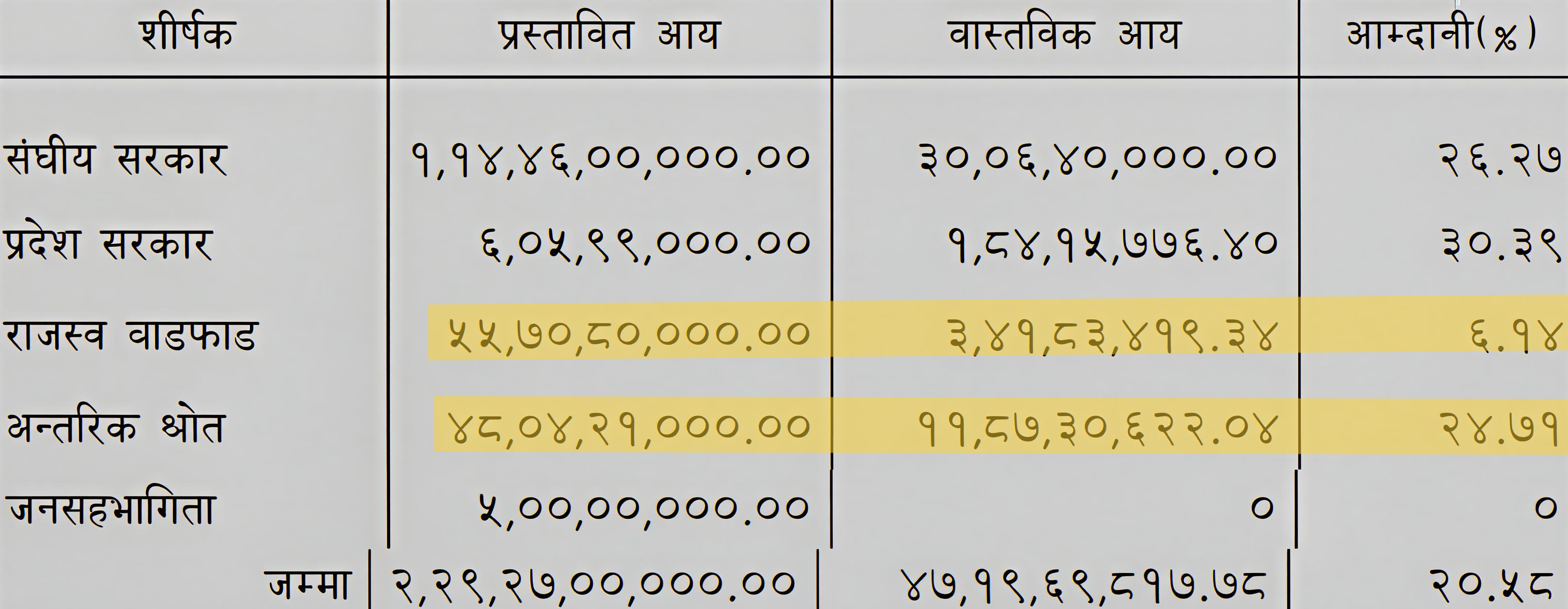 तर, राजश्व बाँडफाँडको अवस्था भने कमजोर देखिन्छ । वार्षिक ५५ करोड ७० लाख ८० हजार आय हुने अनुमान गरिएकोमा पहिलो त्रैमासिक सकिँदासम्म ३ करोड ४१ लाख ८३ हजार प्राप्त भएको छ, जुन लक्ष्यको जम्मा ६.१४ प्रतशित मात्र हो । यता, जनसहभागिताबाट ५ करोड उठाउने लक्ष्य राखेको उपमहानगरले पहिलो त्रैमासिकमा एक रुपैयाँ पनि संकलन नभएको जनाएको छ ।