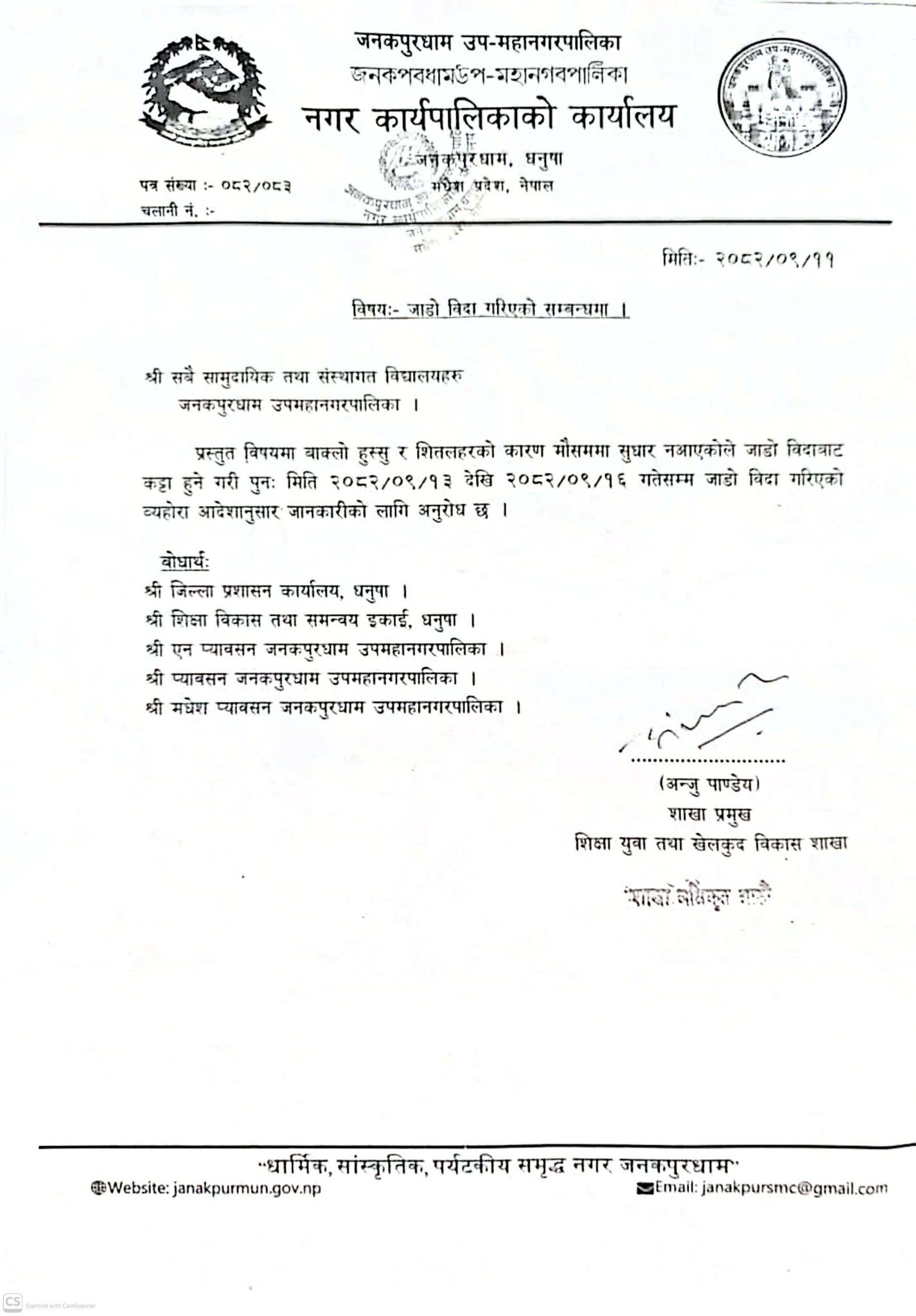 जनकपुरधाम उपमहानगरपालिकाको शिक्षा, युवा तथा खेलकुद विकास शाखाले एक सूचना जारी गर्दै आजदेखि १६ गतेसम्म सबै पालिकाभित्रका सम्पूर्ण विद्यालयहरुमा जाडो बिदा दिएको छ ।