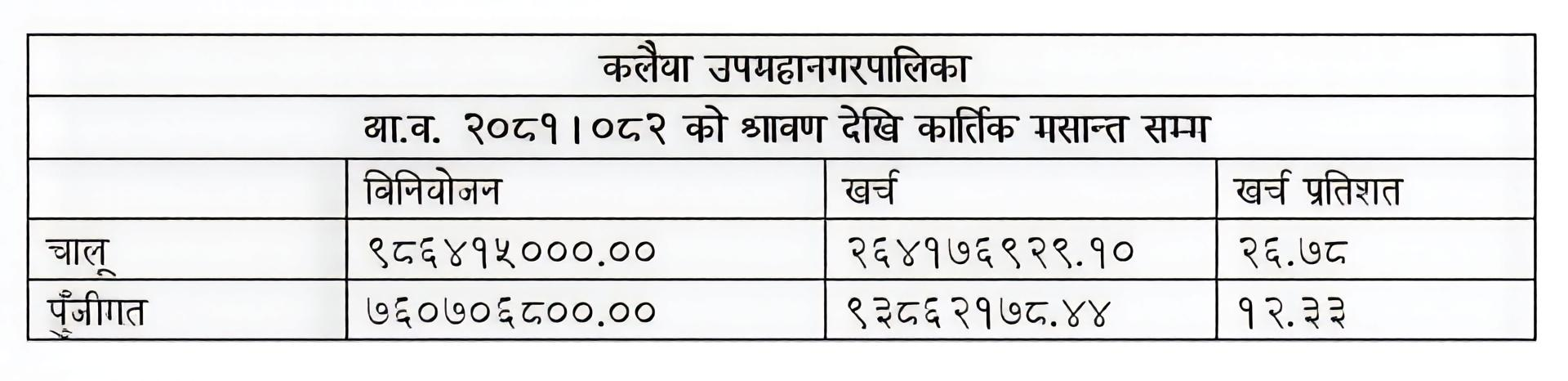 काठमाडौं । बाराको कलैया उपमहानगरपालिकाले चालू आर्थिक वर्ष २०८२–८३ को पहिलो त्रैमासिकमा बजेट खर्चमा अपेक्षित प्रगति हासिल गर्न सकेको देखिँदैन । उपमहानगरले सार्वजनिक गरेको पहिलो त्रैमासिक प्रगति विवरण अनुसार, गत वर्षको तुलनामा यस वर्ष बजेटको आकार बढाए पनि पुँजीगत खर्च खस्किएर १० प्रतिशतभन्दा तल खुम्चिएको छ ।