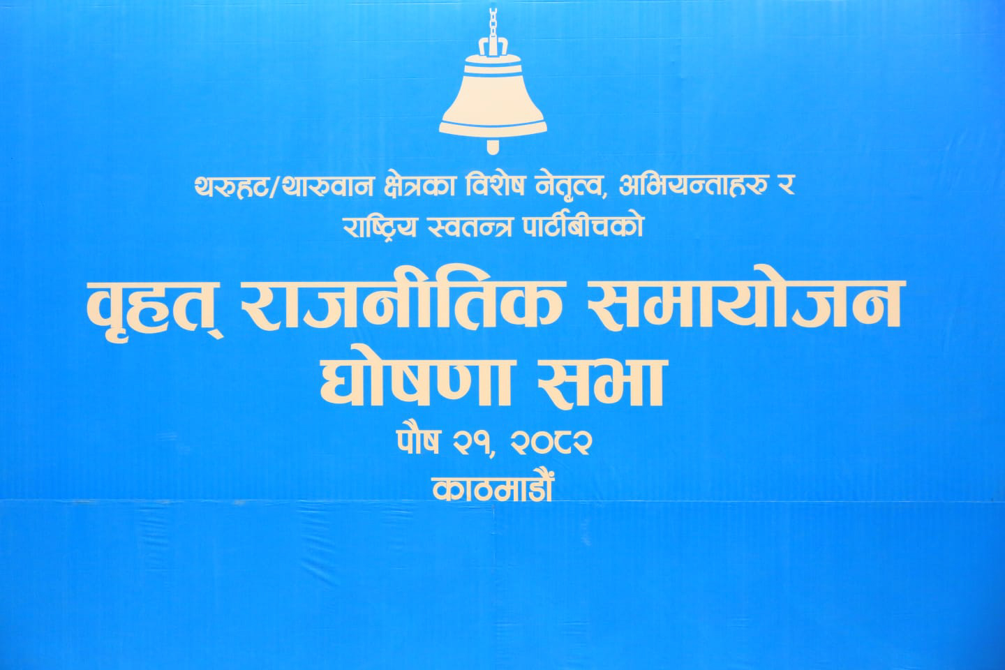 थरुहट र थारुवान क्षेत्रका विशेष नेतृत्व, अभियन्ताहरु र राष्ट्रिय स्वतन्त्र पार्टीबीचको वृहत् राजनीतिक समायोजन घोषणा सभा सुरु भएको छ । काठमाडौंको सभागृहमा आयोजित एक कार्यक्रमकाबीच रास्वपाका सभापति रवि लामिछाने र अन्य अभियन्ताहरुको उपस्थितिमा वृहत् राजनीतिक समायोजन घोषणा गर्न लागिएको हो ।