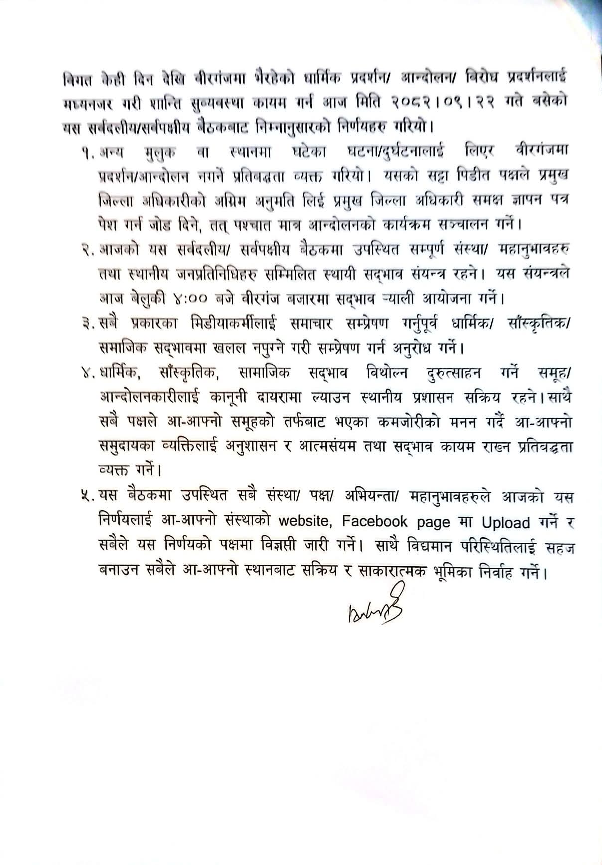 वीरगन्ज । धनुषाको घटनालाई लिएर वीरगन्जमा उत्पन्न तनाव कम गर्न र सामाजिक सद्भाव कायम राख्न जिल्ला प्रशासन कार्यालय पर्सामा बसेको सर्वपक्षीय बैठकले महत्त्वपूर्ण निर्णयहरू गरेको छ ।