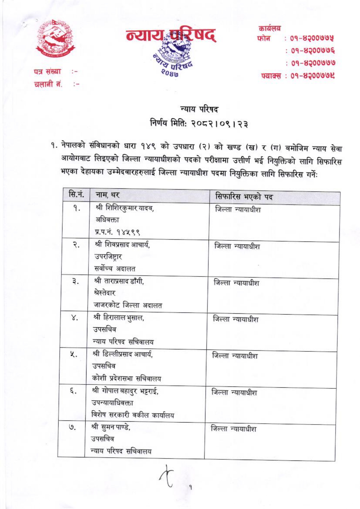 यस पटकको सिफारिस सूचीमा अधिवक्ता शिशिरकुमार यादव पहिलो नम्बरमा परेका छन् । सिफारिस हुने अन्यमा न्याय सेवाका विभिन्न उच्च पदमा कार्यरत कर्मचारीहरू रहेका छन् । जसमा उपरजिस्ट्रारहरू शिवप्रसाद आचार्य, ठाकुरप्रसाद बस्ताकोटी, बासुदेव पाण्डे, कर्णबहादुर राई र हिरामाया अवाल छन् ।