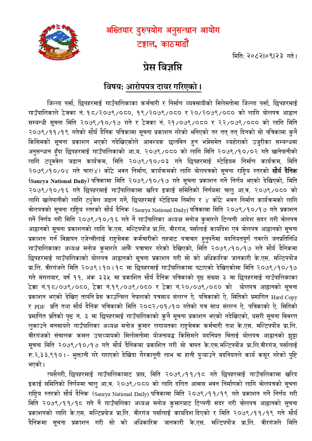 काठमाडौं । पर्साको छिपहरमाई गाउँपालिकामा बोलपत्र (टेन्डर) आह्वानको झुट्टा सूचना खडा गरी भ्रष्टाचार गरेको अभियोगमा अख्तियार दुरुपयोग अनुसन्धान आयोगले गाउँपालिका अध्यक्षसहितका कर्मचारी र व्यवसायीविरुद्ध विशेष अदालतमा मुद्दा दायर गरेको छ ।