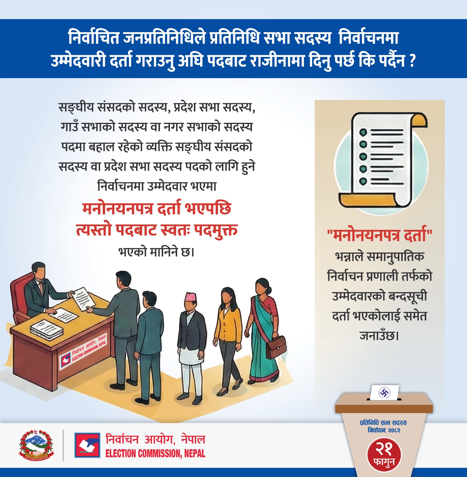 आयोगका अनुसार सङ्घीय संसदको सदस्य, प्रदेश सभा सदस्य, गाउँ सभाको सदस्य वा नगर सभाको सदस्य पदमा बहाल रहेको व्यक्तिले सङ्घीय संसद वा प्रदेश सभा सदस्य पदका लागि हुने निर्वाचनमा उम्मेदवार भएमा मनोनयनपत्र दर्ता भएपछि त्यस्तो पदबाट स्वतः पदमुक्त भएको मानिनेछ।