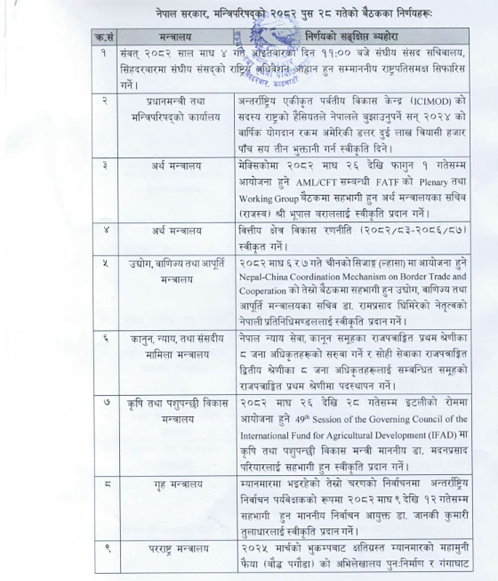 यी हुन् मन्त्रिपरिषद् बैठकका मुख्य १९ निर्णय