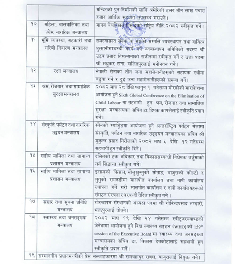 काठमाडौं । सोमबार बसेको मन्त्रिपरिषद् बैठकले नियुक्ति, कर्मचारी बढुवा र विदेश भ्रमणसहितका विभिन्न १९ वटा निर्णयहरू गरेको छ ।