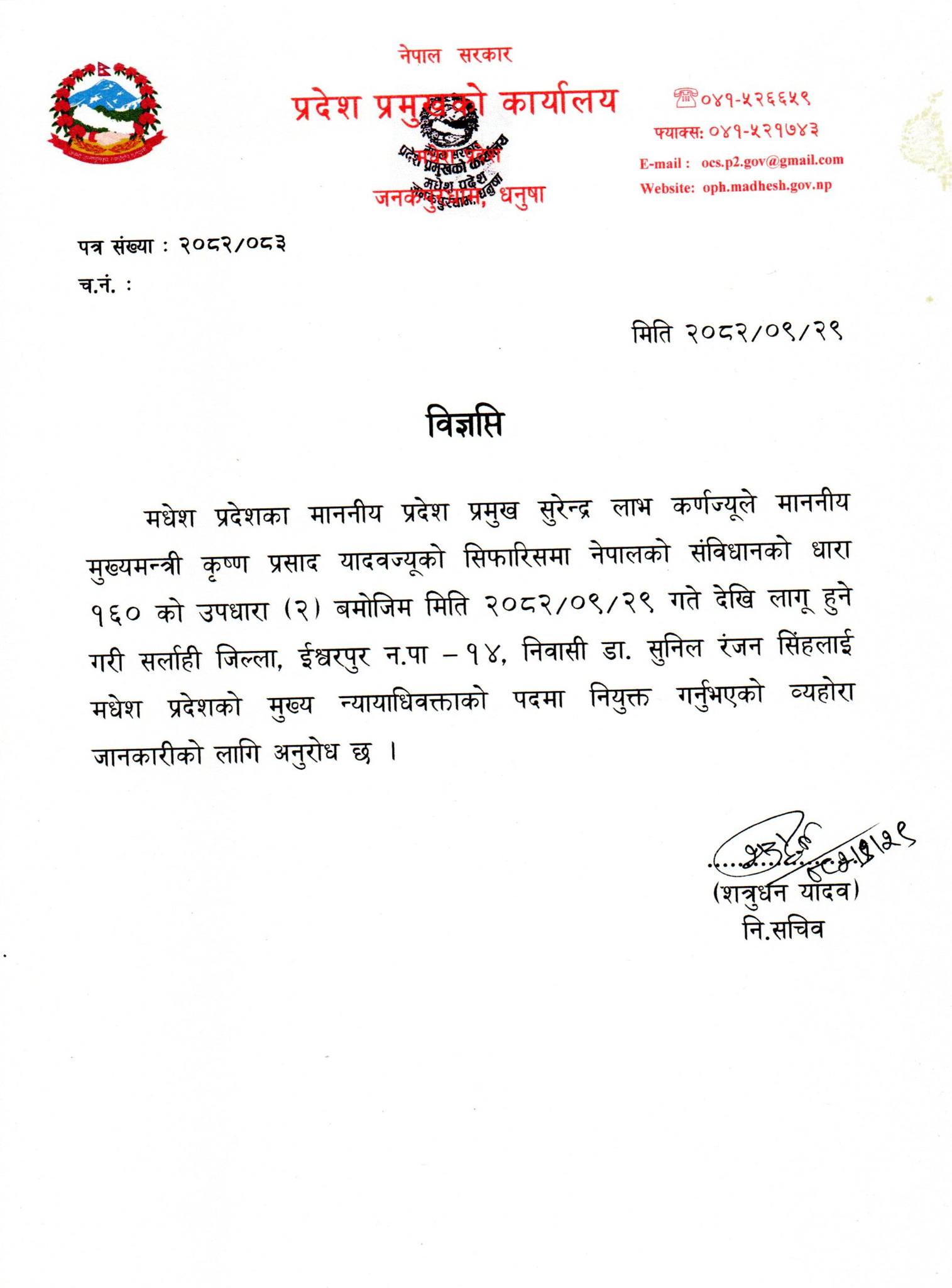 प्रदेश प्रमुख डा. सुरेन्द्र लाभ कर्णले मुख्यमन्त्री कृष्ण प्रसाद यादवको सिफारिसमा मंगलबार डा. सिंहलाई मधेश प्रदेशको मुख्य न्यायाधिवक्ताको पदमा नियुक्त गरेका छन् । नेपालको संविधानको धारा १६० को उपधारा (२) बमोजिम आजदेखि लागू हुने गरी सर्लाही जिल्ला ईश्वरपुर नगरपालिका–१४ निवासी डा. सिंहलाई मुख्य न्यायाधिवक्ताको जिम्मेवारी दिइएको प्रदेश प्रमुखको कार्यालयलद्वारा जारी विज्ञप्तीमा उल्लेख रहेको छ ।