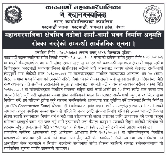 काठमाडौं । काठमाडौं महानगरपालिकाले महानगर क्षेत्रभित्र नदीको दायाँ–बायाँ भवन निर्माण अनुमति रोक्का नरहेको जनाएको छ । महानगरपालिकाले आज सूचना जारी गर्दै सर्वोच्च अदालतको आदेशअनुसार नदीको दायाँ–बायाँ भवन निर्माण गर्न अनुमति दिइएको जनाएको हो। यसअघि नदीको दायाँ–बायाँ भवन निर्माण गर्न प्रतिबन्ध लगाइएको थियो ।