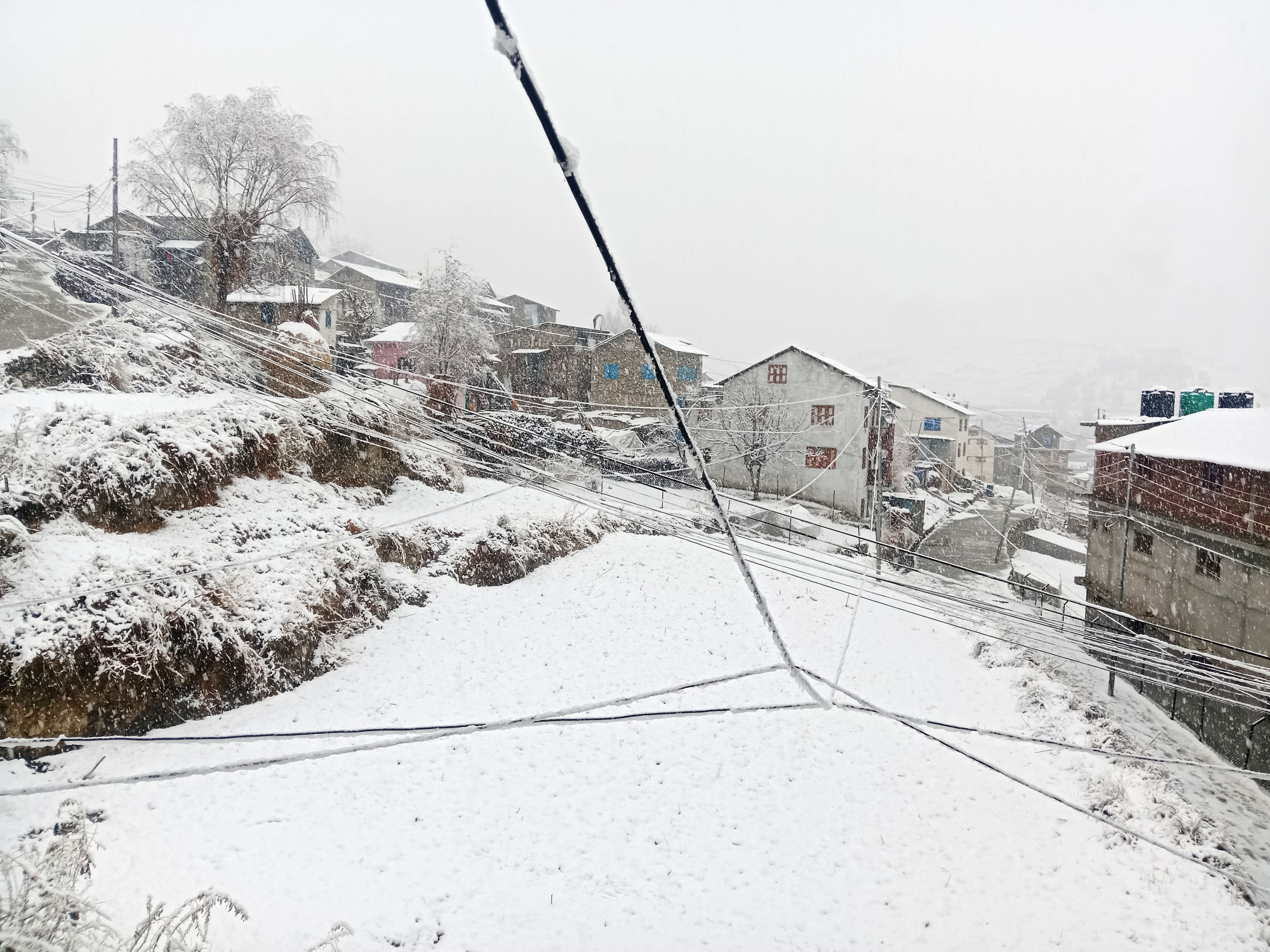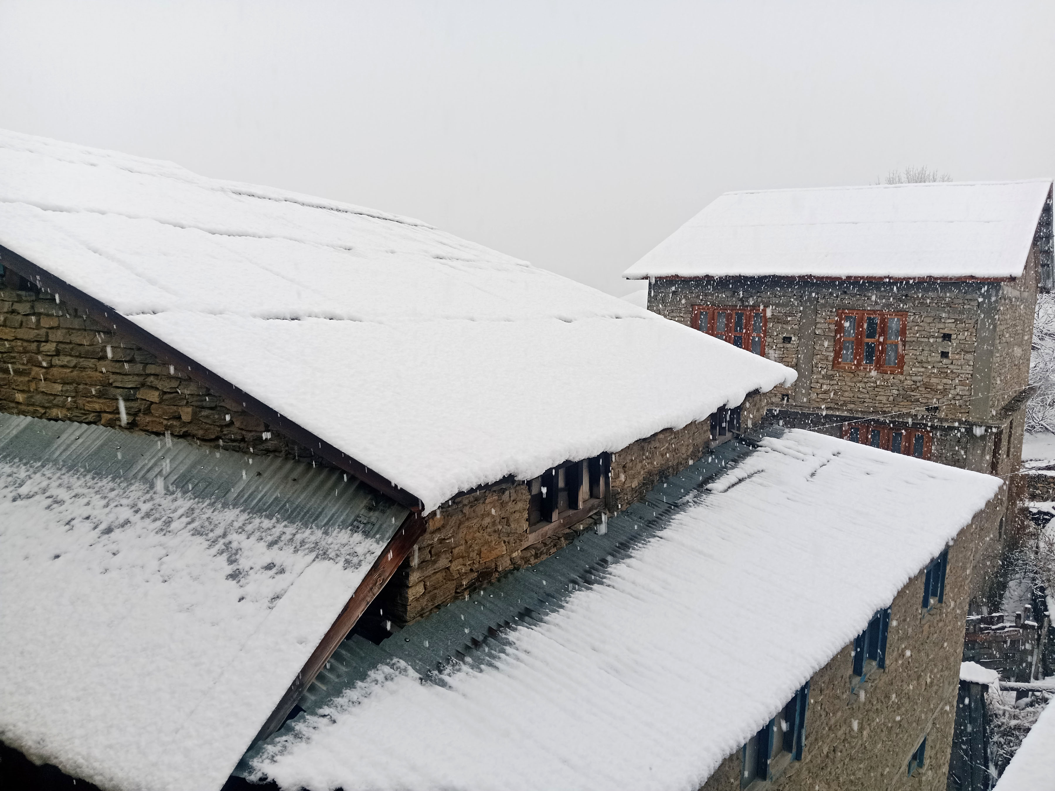 हिमपातपछि सेताम्मे देखिएको जुम्ला सदरमुकाम खलङ्गा बजार क्षेत्र । हिमपात भएसँगै खेती सप्रने भएपछि यहाँका किसान खुसी भएका छन् ।