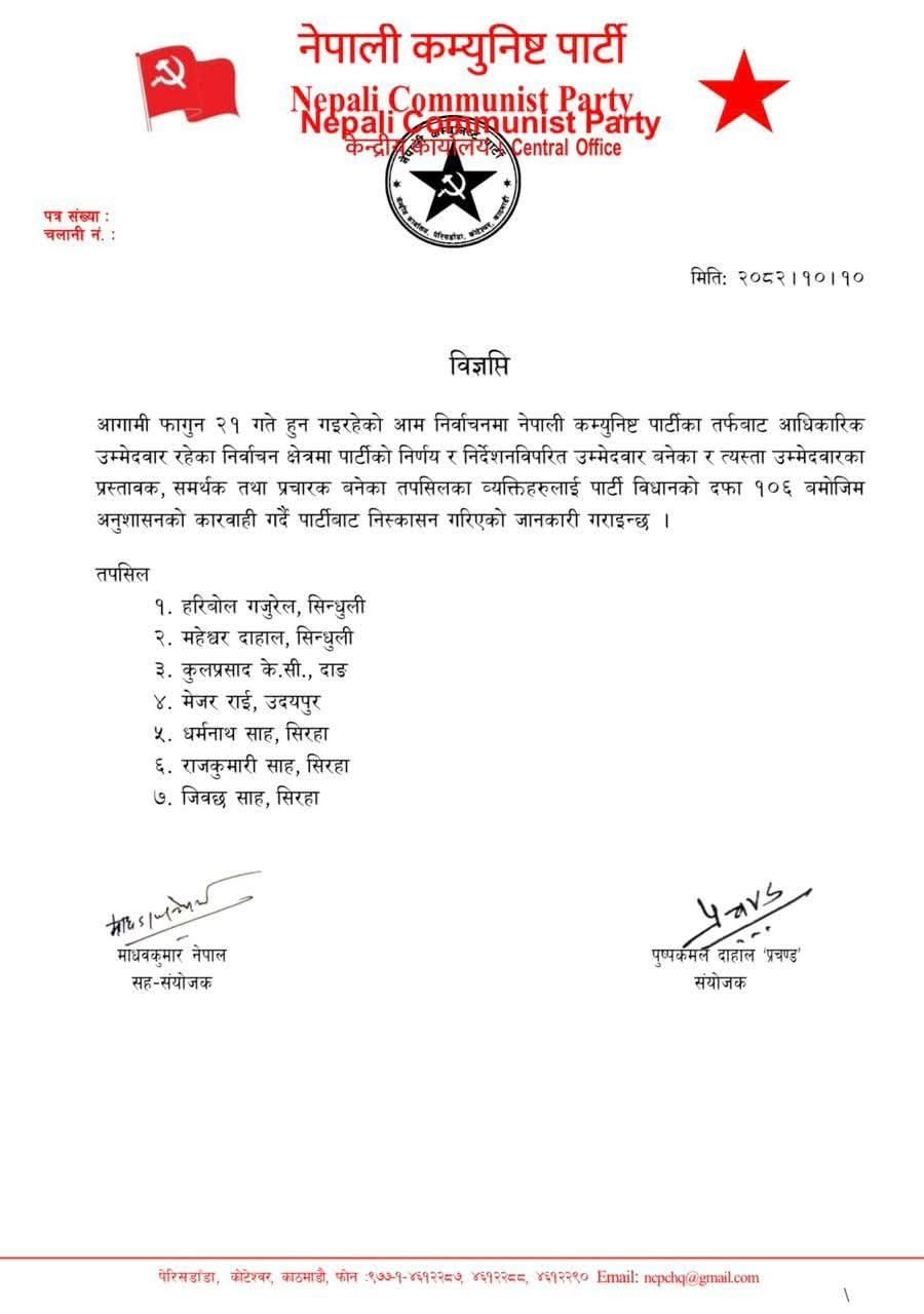 आगामी फागुन २१ गते हुने आम निर्वाचनका लागि पार्टीका आधिकारिक उम्मेदवार रहेका निर्वाचन क्षेत्रमा पार्टीको निर्णयविपरीत उम्मेदवार बनेका तथा त्यस्ता उम्मेदवारका प्रस्तावक, समर्थक र प्रचारकको भूमिकामा रहेका व्यक्तिलाई पार्टी विधानको दफा १०६ अनुसार अनुशासनात्मक कारबाही गर्दै निस्कासन गरिएको पार्टीले जनाएको छ ।