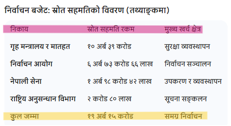 निर्वाचन आयोगलाई मात्र कुल ६ अर्ब ७३ करोड ६६ लाख ९० हजार रुपैयाँको स्रोत सहमति दिइएको छ, जसमध्ये ६ अर्ब ३१ करोड निकासा भइसकेको छ । निर्वाचनलाई भयरहित र सुरक्षित बनाउन सुरक्षा निकायहरूलाई समेत ठुलो बजेट विनियोजन गरिएको छ ।