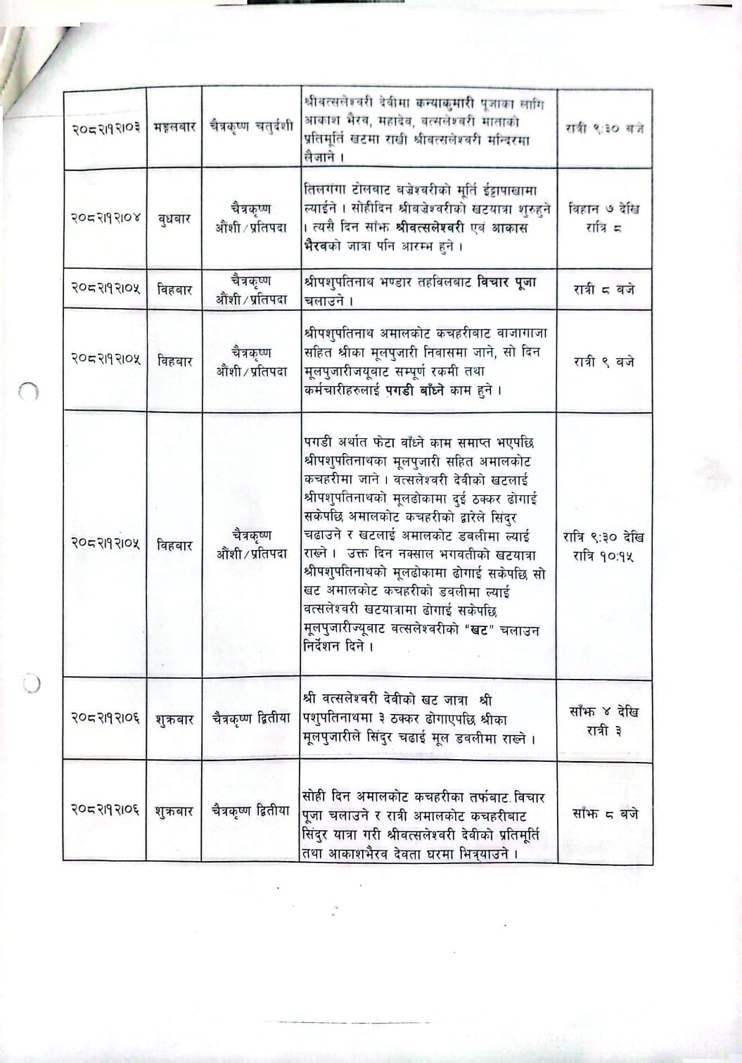 पशुपति देवपत्तनमा पूजा, पाहाँचरे पर्व, माता श्री वत्सलेश्वरी देवी एवं माता बज्रेश्वरी देवीको पर्व पूजा तथा जात्राको कार्यक्रमको समय तालिका सार्वजनिक भएको हो ।